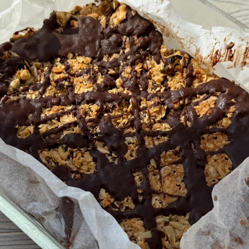 Aus dem Ofen nehmen und vollständig abkühlen lassen. Die geschmolzene Schokolade darüber dünn verteilen und die Form 30 Minuten in den Kühlschrank stellen (oder über Nacht für eine festere, weniger krümelige Konsistenz), bis alles angezogen ist. In Riegel oder Quadrate schneiden.