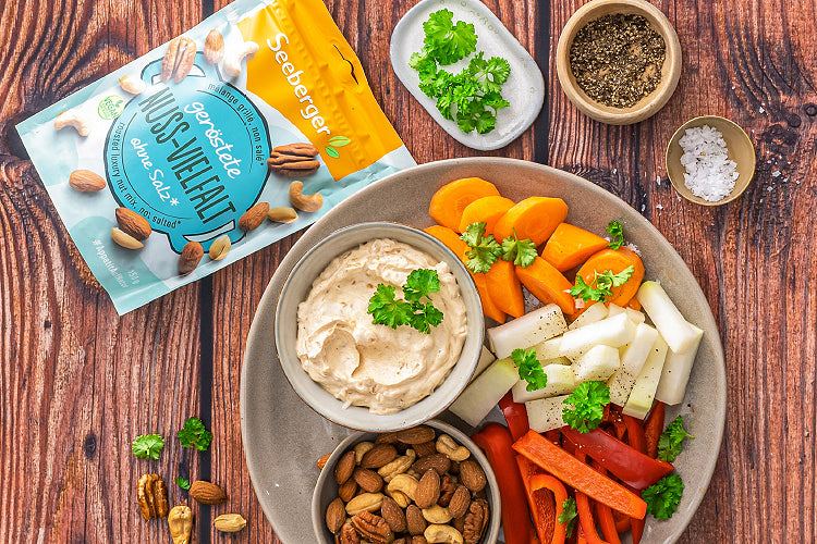 Das Gemüse in mundgerechte Stücke schneiden und auf einer Platte anrichten. Die Seeberger Nuss Vielfalt in eine Schale geben und gemeinsam mit dem French Onion Dip auf der Snack Platte anrichten.